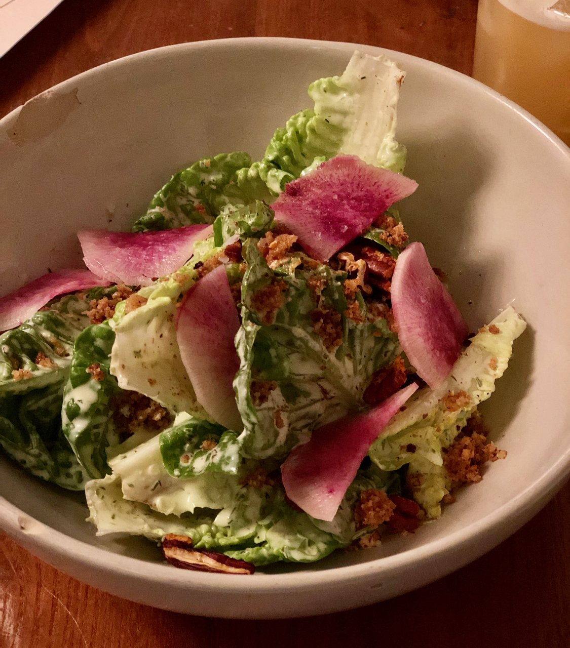 - Little Gem Salad, buttermilk dressing, breadcrumbs, bbq pecans, watermelon radish