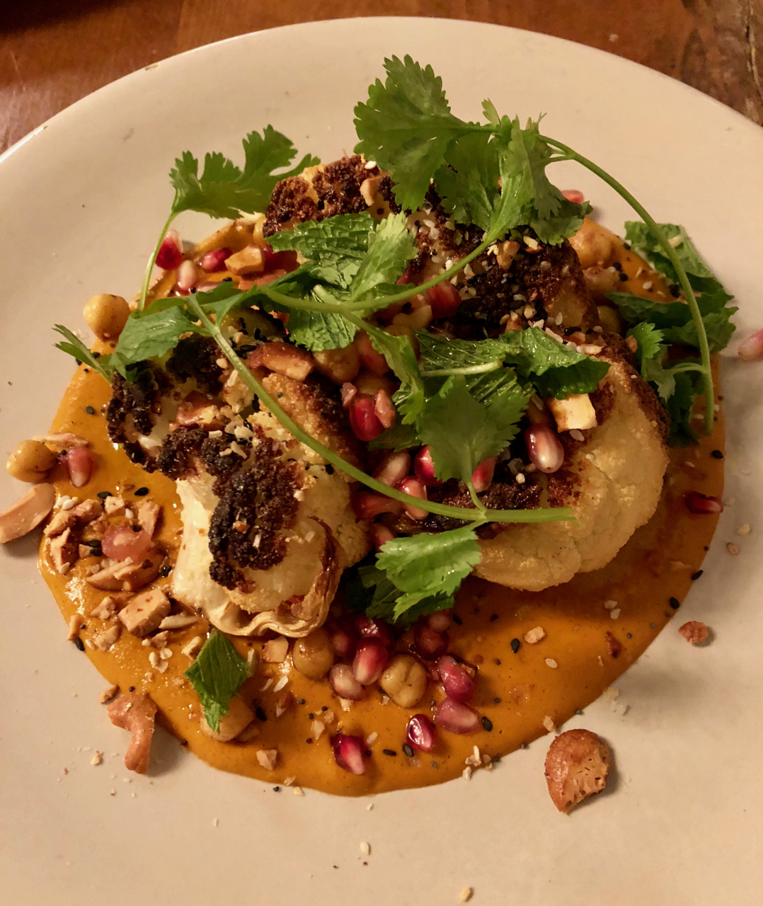 - Roasted Cauliflower, curry, cashews, fried chickpeas, pomegranate, mint